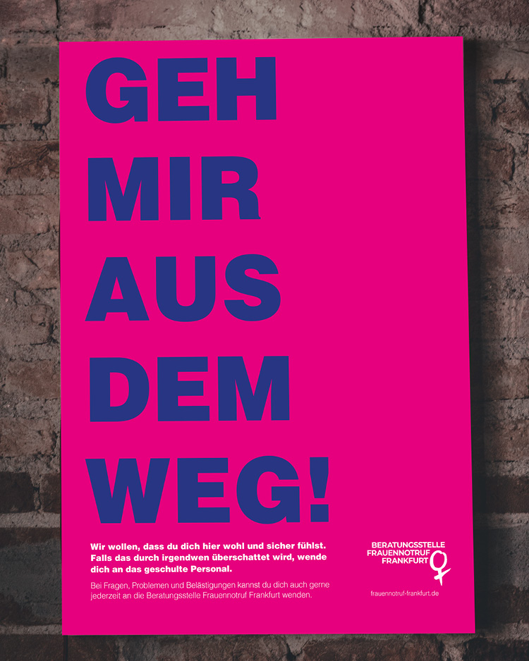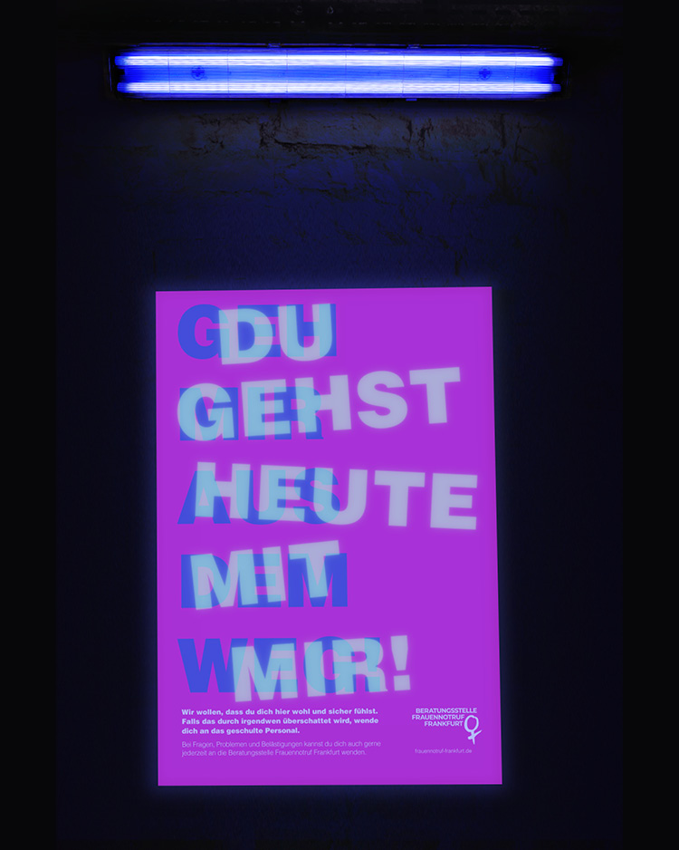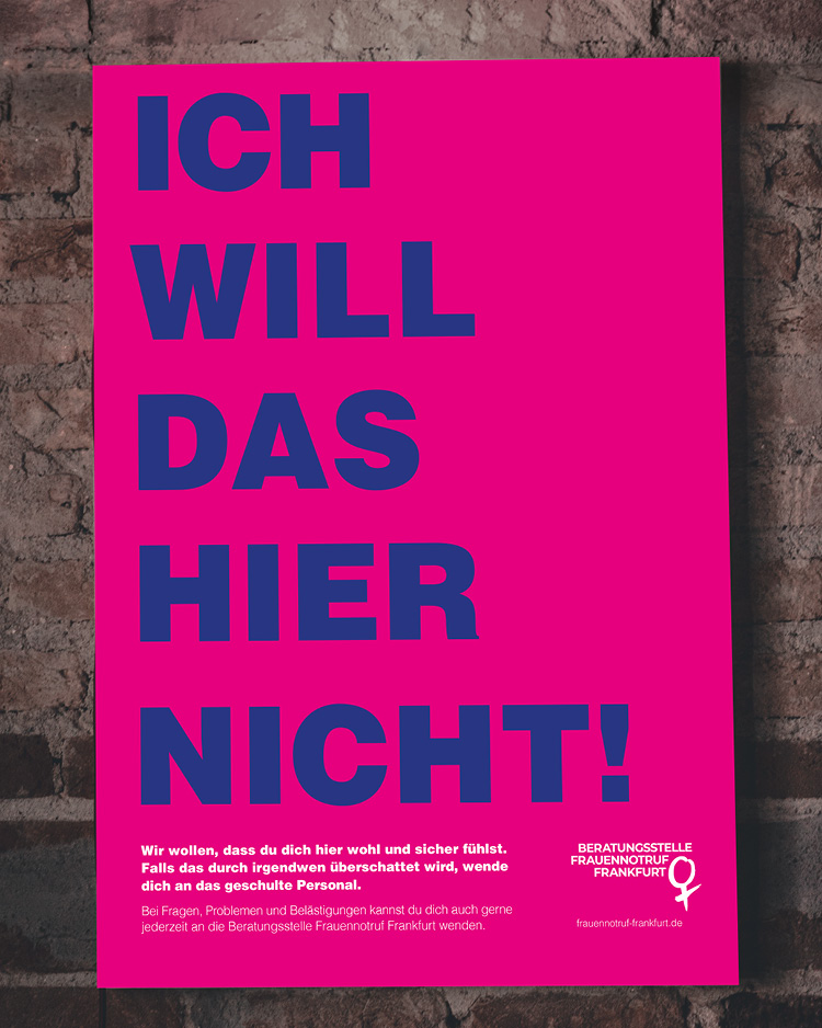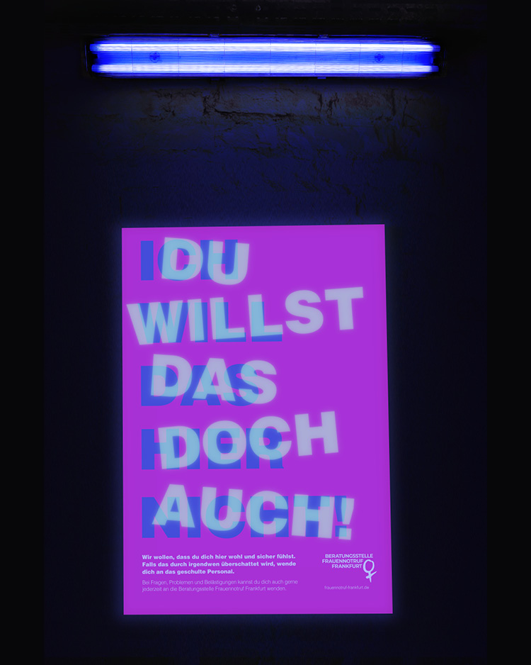 It is an unfortunate fact that women face issues such as sexual harassment and domestic violence everywhere in Germany. A silent movie that addresses the silence on violence against women, posters that reveal the hidden pick-up thoughts of the man in the club in black light, and washing labels with the contact details of the Frauennotruf Frankfurt women’s emergency hotline. All three campaigns are designed to raise awareness of sexual harassment and domestic violence against women.